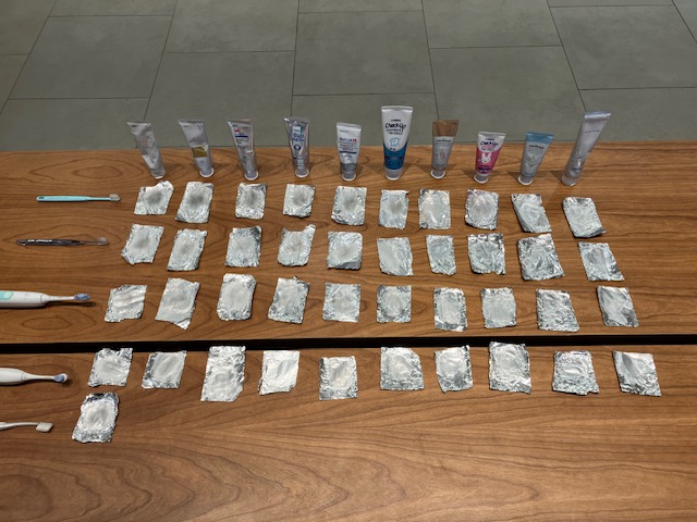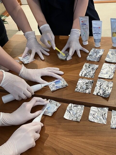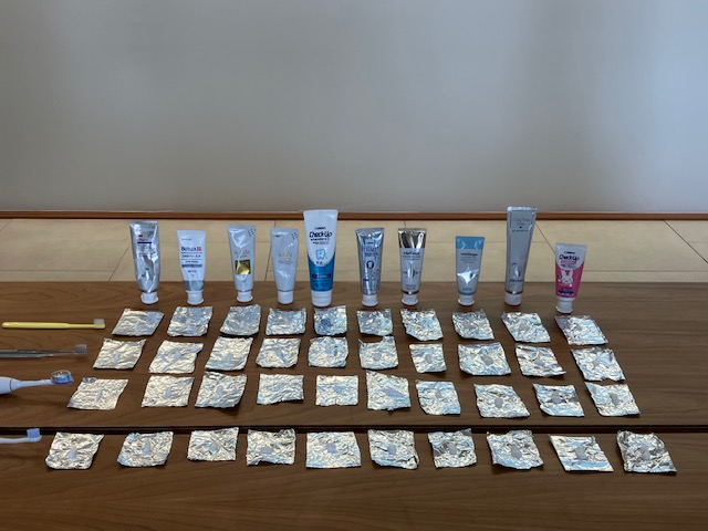 現在院内で販売されている歯磨剤と歯ブラシ、電動歯ブラシを使用し、アルミホイルを用い歯磨剤の清掃力の実験を行いました!